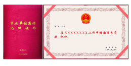 证书规格为245×170mm。封面选用大红色丝绸材料,烫金印制“事业单位工作人员嘉奖证书”字样。内页为浅黄色,花边图案为卷草纹,硬卡纸。其中,左上部分为获奖同志姓名(字体为大标宋简体,23号字),中间部分为受到何种奖励(字体为魏碑,44号字),右下部分为颁奖单位印章和日期(字体为大标宋,18号字)。