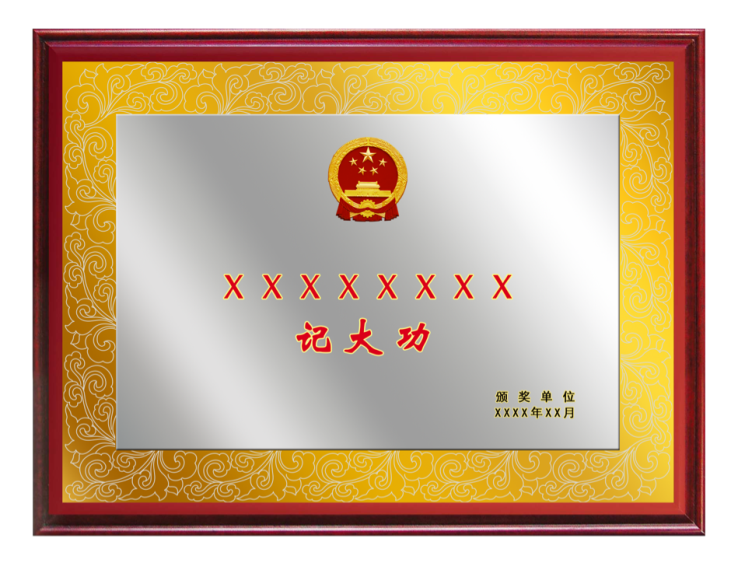 说明:奖牌正中上方为一枚金属材质国徽,中间部分分别为获奖集体名称(字体为魏碑,78号字)、受到何种奖励(字体为魏碑,95号字),右下部分为颁奖单位名称和颁奖日期(字体为黑体,30号字)。